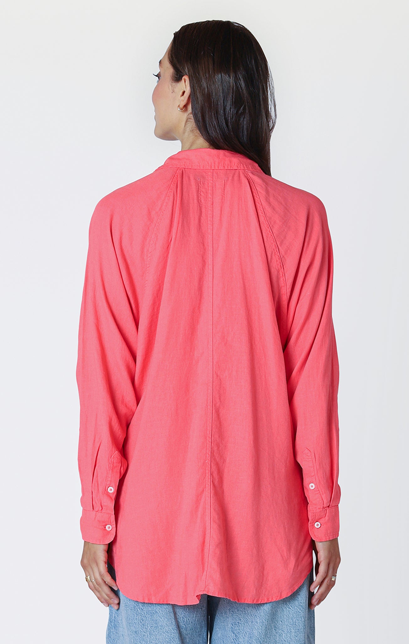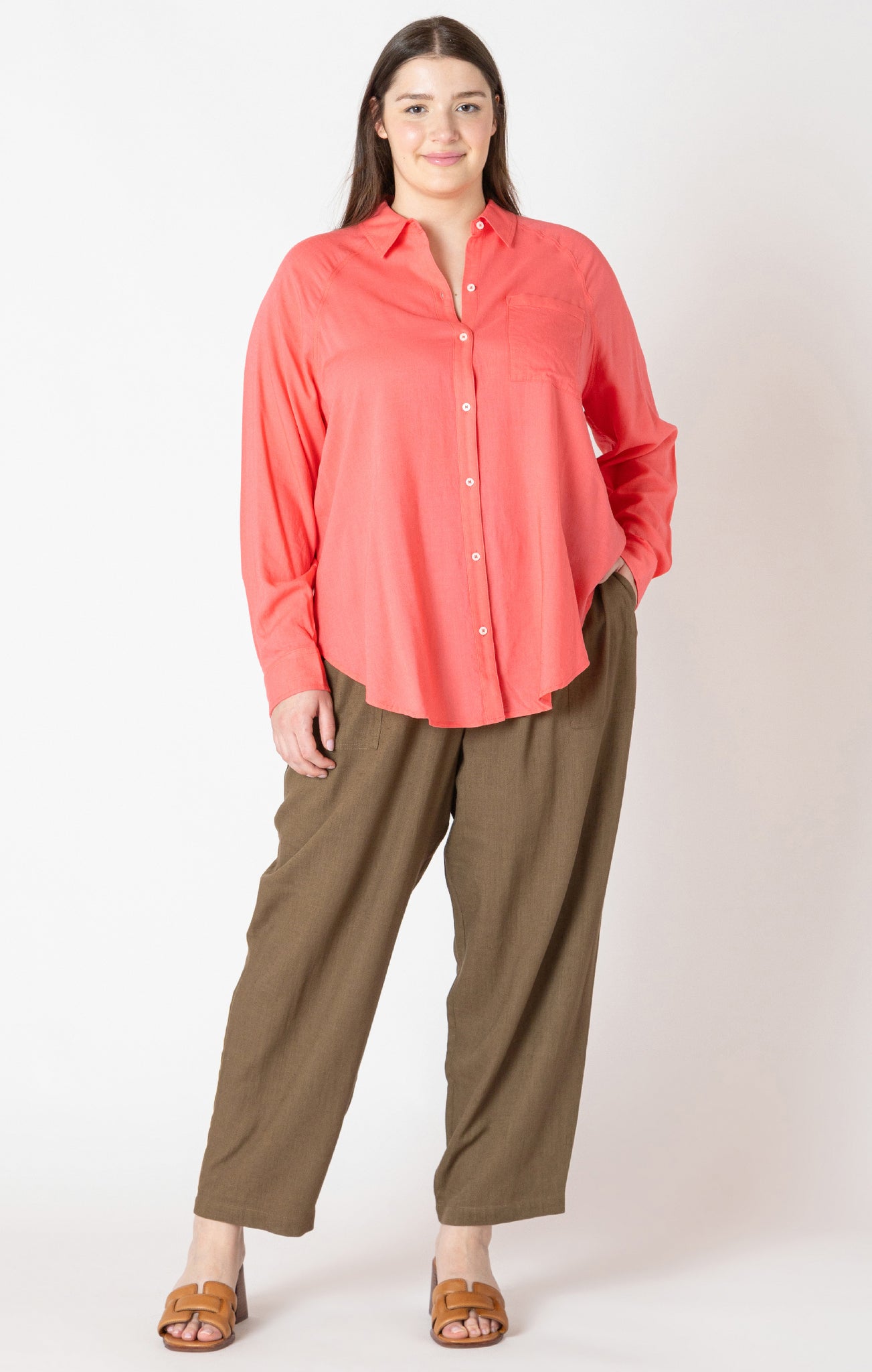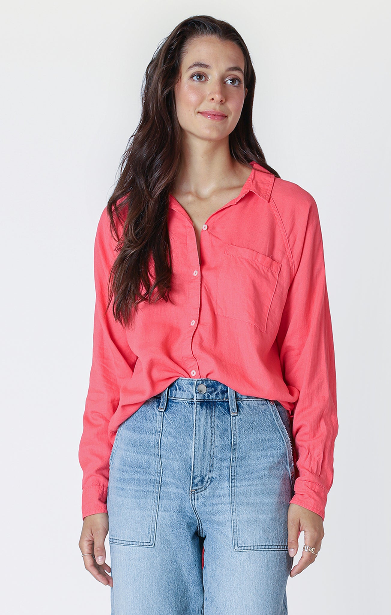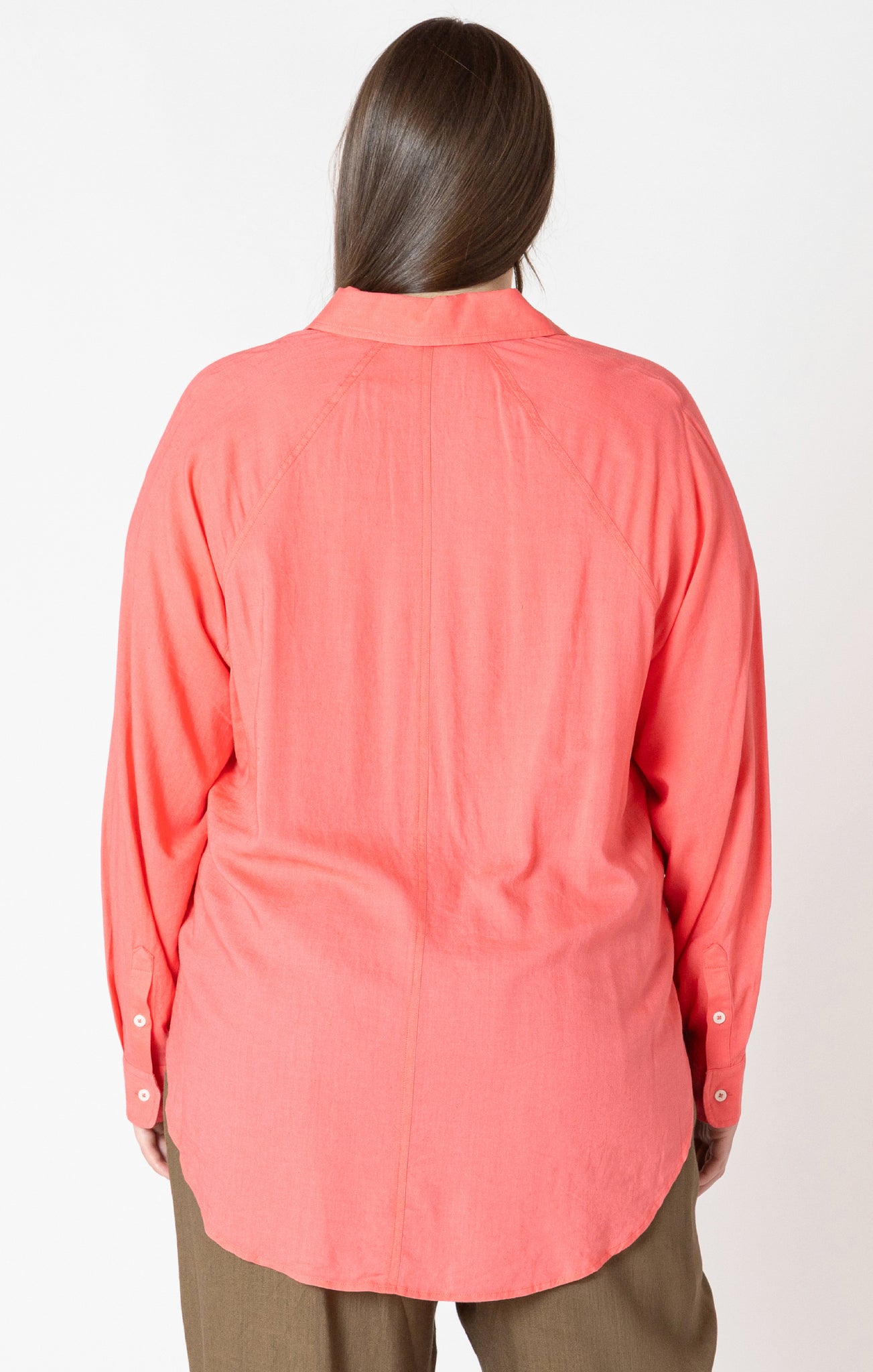 This super soft button up in bright coral is a great transitional top. Pair it under your favourite blazer, or wear it open with a white tank and cut offs. We love multi-purpose pieces! Features rounded hem and flattering raglan cut sleeves.