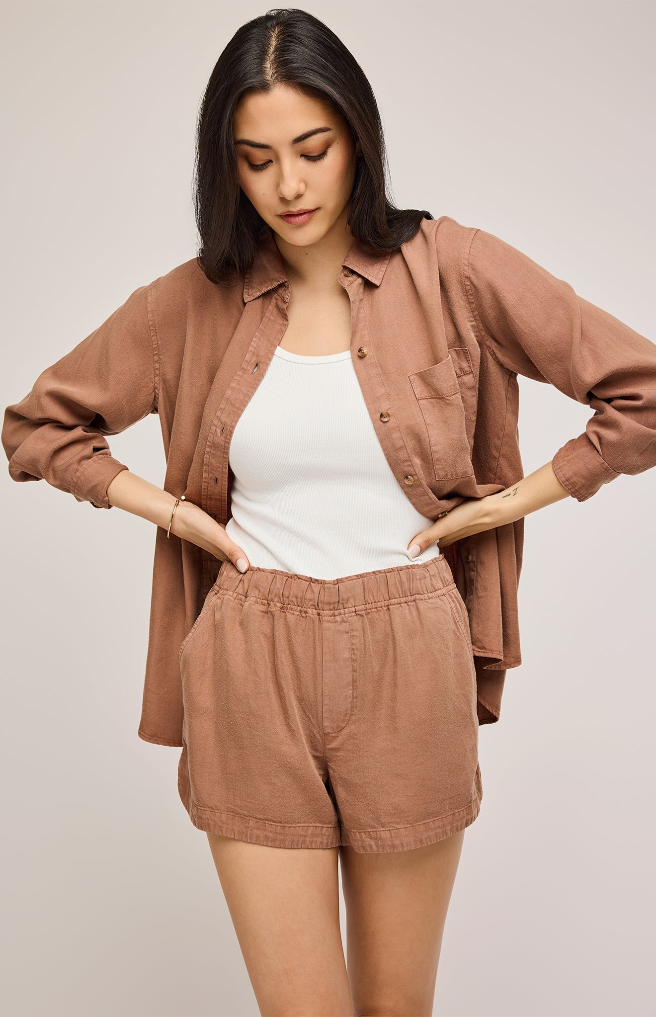 The Wyatt short is made of Tencel fabric that has been specially washed to achieve a dimensional look and soft feel. Features include an elasticated waistband, slash pockets, and faux fly detail. Complete the look with the Ozzy button-down shirt.